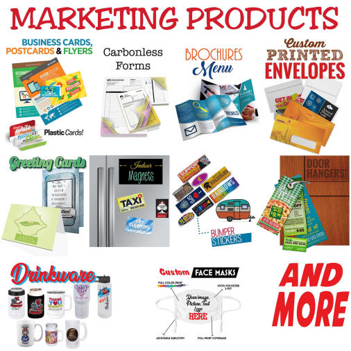 Mugs, Socks, Water Bottles, Ornaments, Business Cards, Postacards, Flyers, Brochures, Carbonless Forms, Menus, Envelopes, and more...